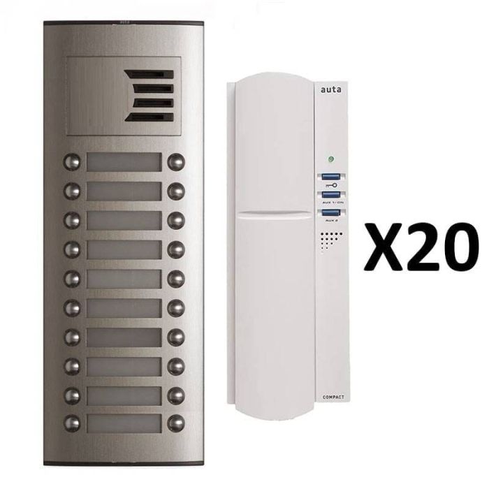 نظام انتركم صوتى يحتوي على 1 لوحة من الألومنيوم المؤكسد مثبتة داخل الحائط مع x 20 زر و1 مايك 509051 و 20 سماعة بيضاء 700305 مع 1 محول 715503 ((12 فولت))